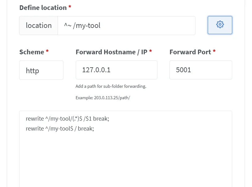 nginxrewrite ^/my-tool/(.*)$ /$1 break; rewrite ^/my-tool$ / break;